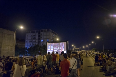 La pantalla hinchable de gran tamaño que utilizamos, el proyector NEC 7000 lumens Full HD y el equipo de sonido convirtieron el puente del Distrito de Retiro en el mejor cine de verano.